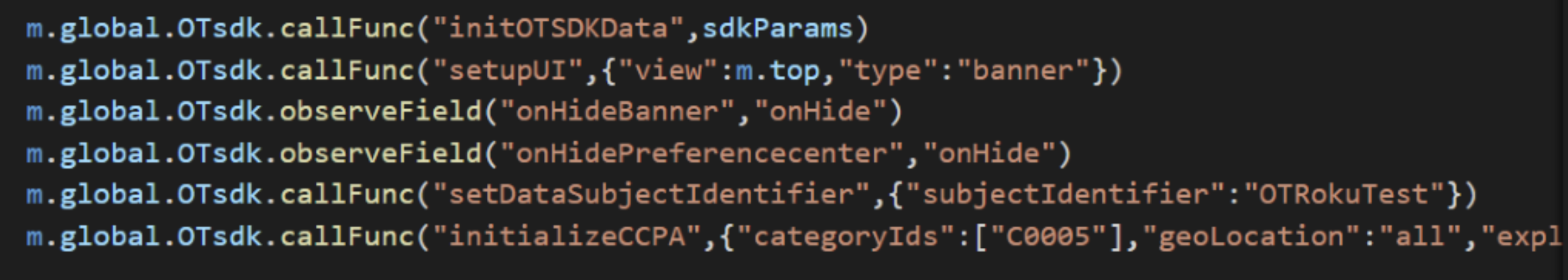 - Once we create the OTsdk init(), the sdkParams values such as appId, location, language and version need to be set and call the public method initOTSDKData() in the OTinitialize.brs file. The declaration also prompts the SDK data download.